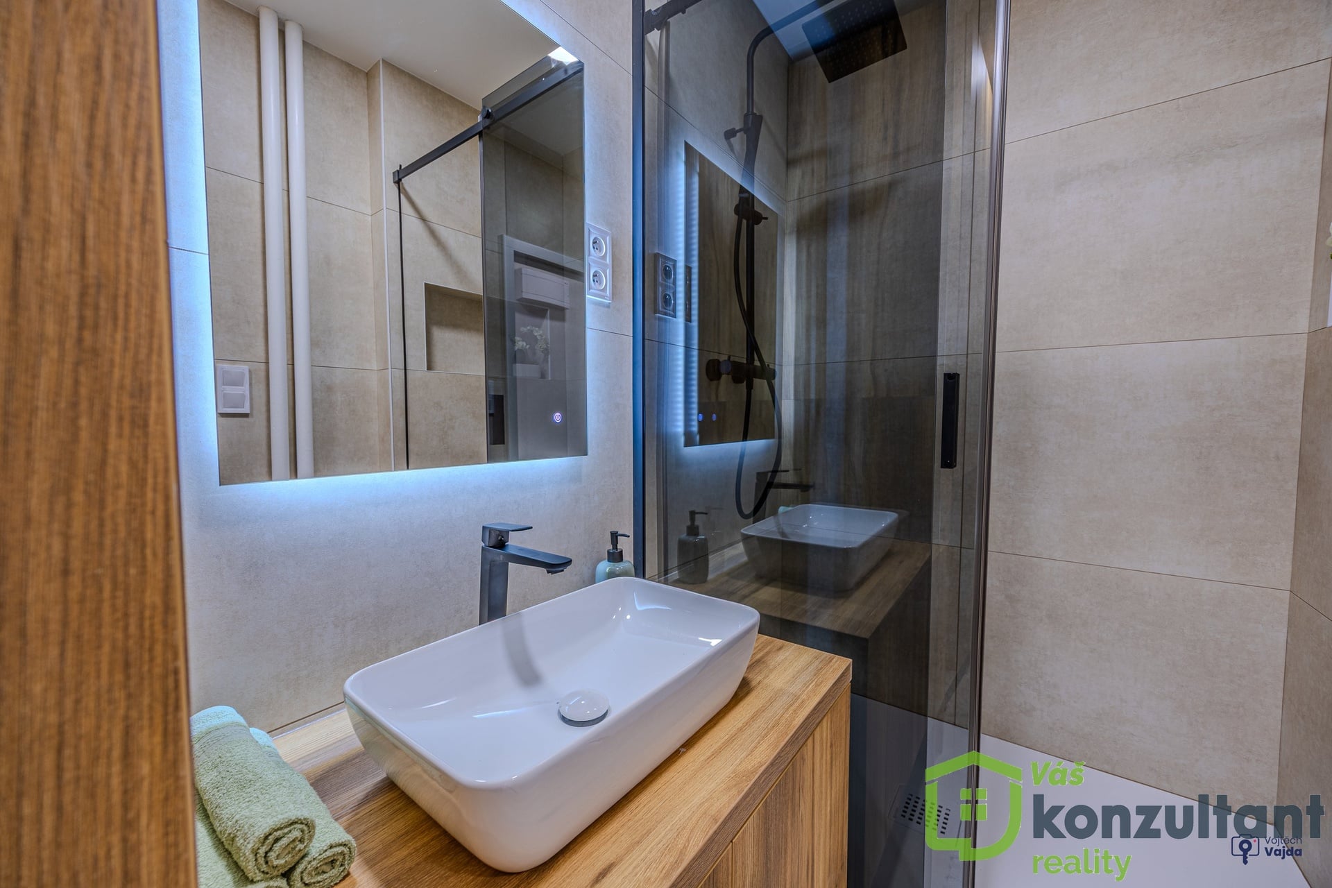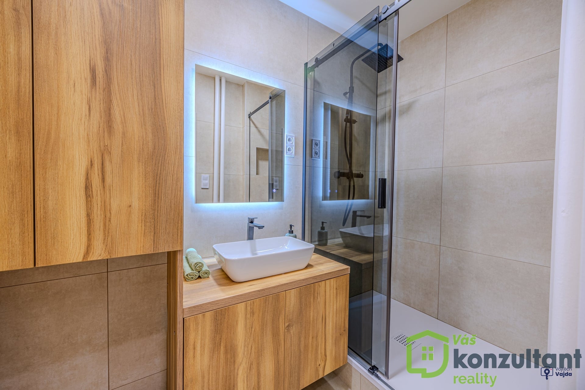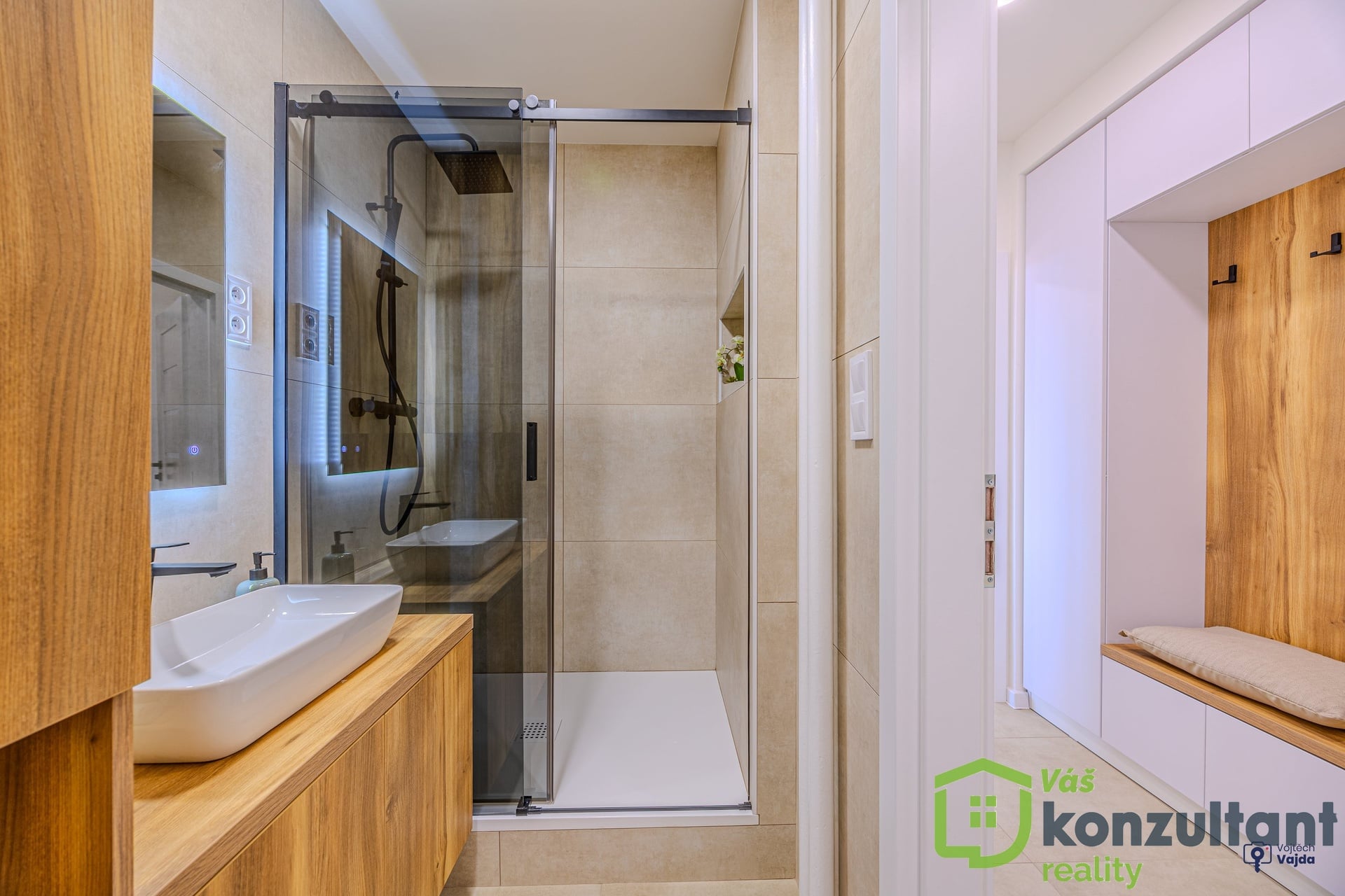 V celém bytě jsou podlahy s provedenou nivelací a pokládkou z lepeného vinylu. V předsíni, v koupelně a na WC je velkoformátová dlažba a obklady. Jádro je zděné, rozvody vody a odpadů v plastu, elektřina v mědi, SDK podhledy, nové sádrové omítky. Nové interiérové dveře s obložkami. Kuchyně je vyrobena na míru s vestavěnými spotřebiči a indukční varnou deskou, vše značky Beko. V koupelně je sprchový kout s nikou s led osvětlením a skříň, vyrobená na míru pro umístění pračky. V předsíni na míru vyrobená vestavěná skříň s botníkem. Ve všech pokojích je k zásuvkám vyvedeno internetové připojení. Vypínače k osvětlení se stmívači v dětském pokoji a v ložnici umožňují měnit intenzitu osvětlení dle potřeby.