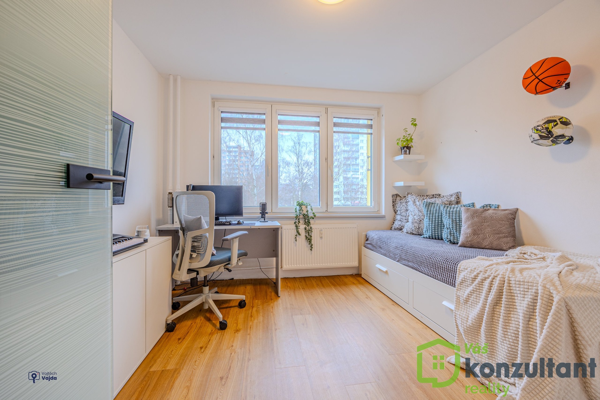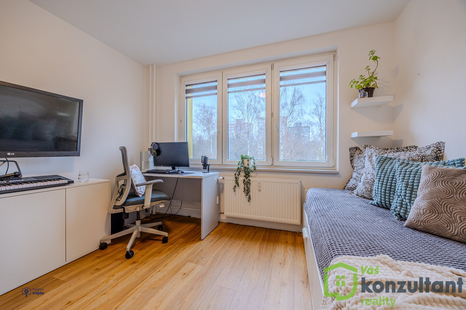 V bytě jsou čtyři pokoje, v tuto chvíli sloužící jako ložnice, obývací pokoj s kuchyní a dva dětské pokoje. Dále byt disponuje prostornou šatnou. Z ložnice je vstup na zasklenou lodžii. V bytě je klasické ústřední topení, studená i teplá voda z vodovodního řádu a bezpečnostní vchodové dveře.