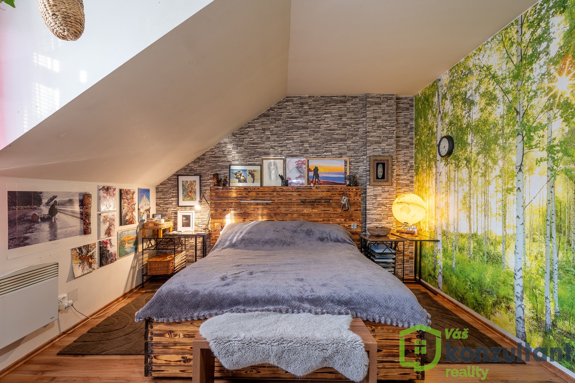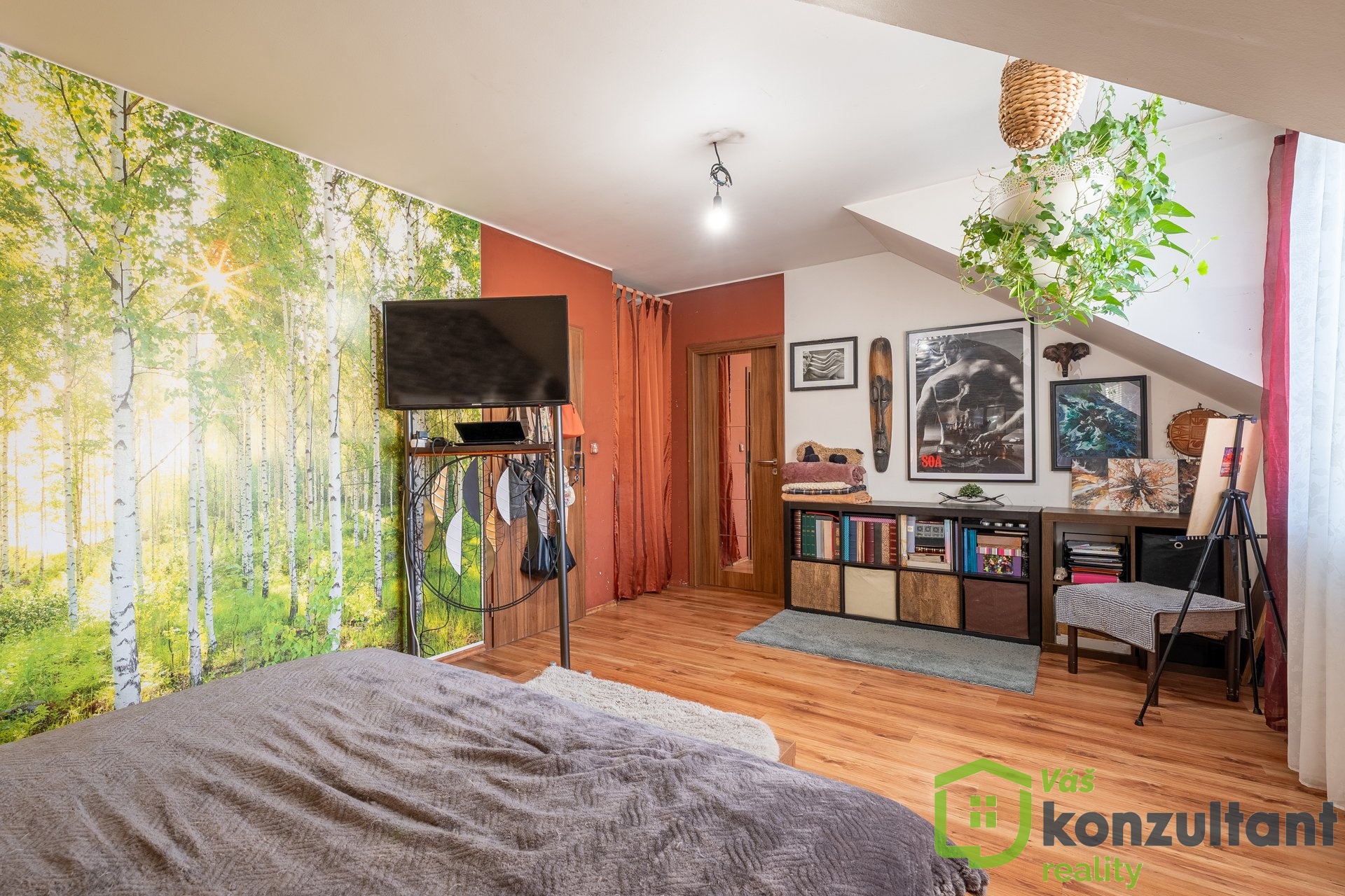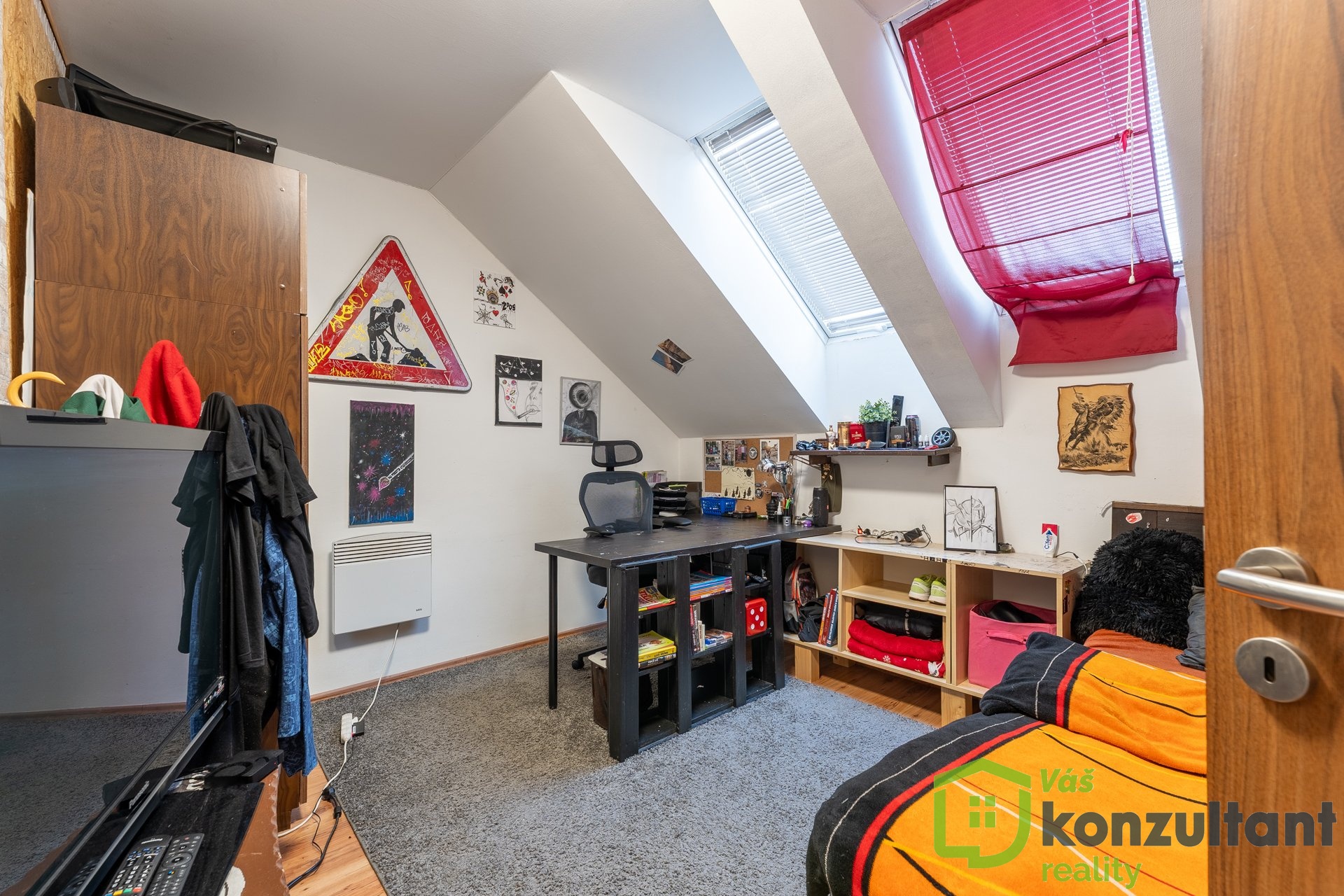 V patře jsou umístěny dva dětské pokoje s možností jejich propojení do jednoho většího prostoru a dále ložnice s praktickou šatnou. V patře se nachází druhá, prostorná koupelna s rohovou vanou a toaletou.