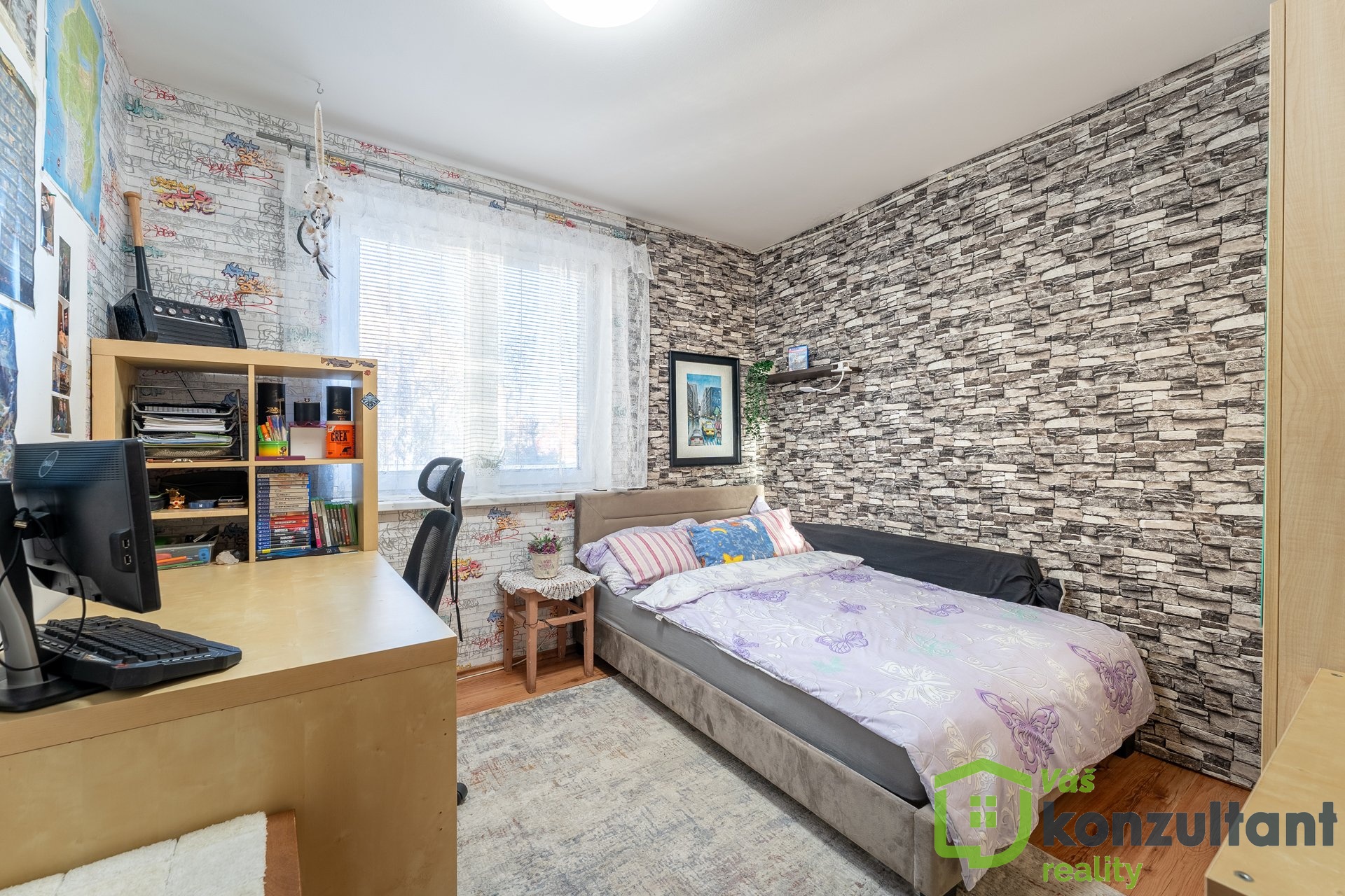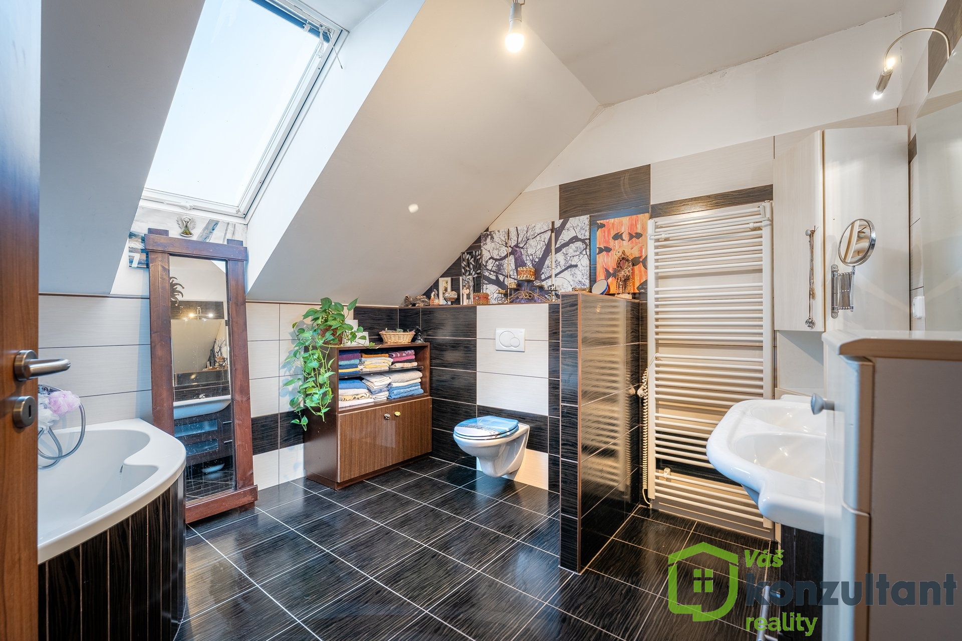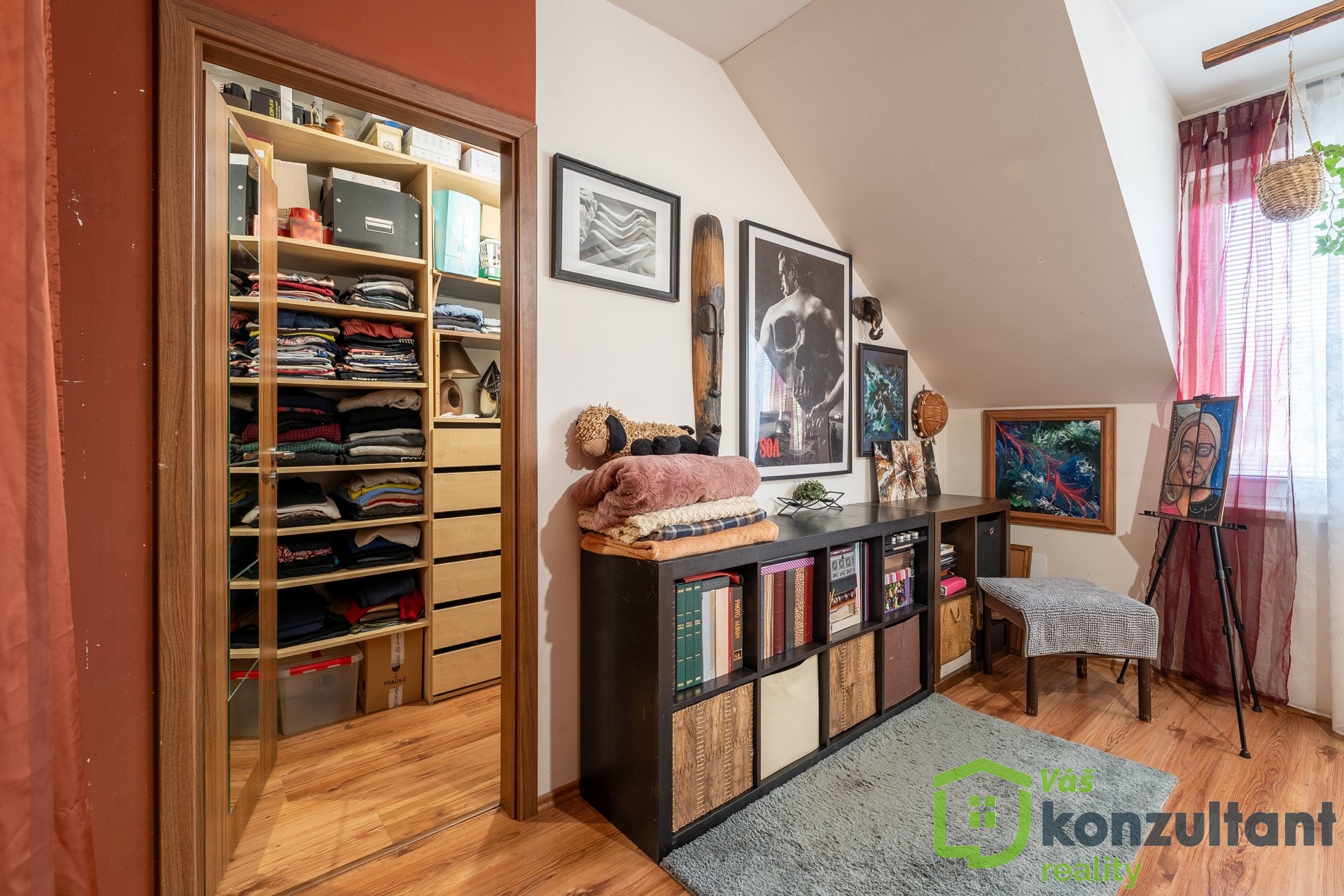 V patře jsou umístěny dva dětské pokoje s možností jejich propojení do jednoho většího prostoru a dále ložnice s praktickou šatnou. V patře se nachází druhá, prostorná koupelna s rohovou vanou a toaletou.