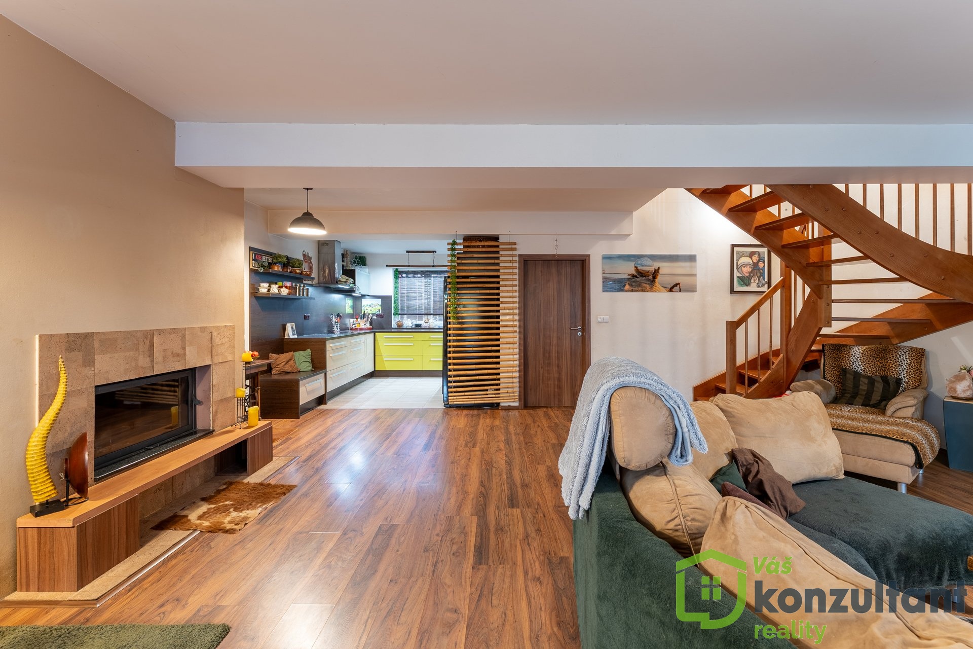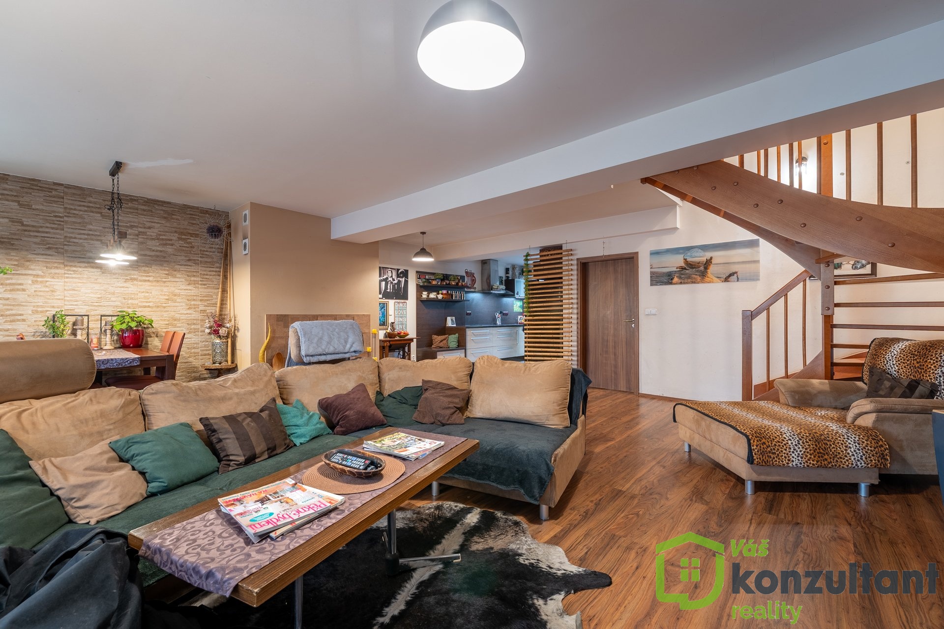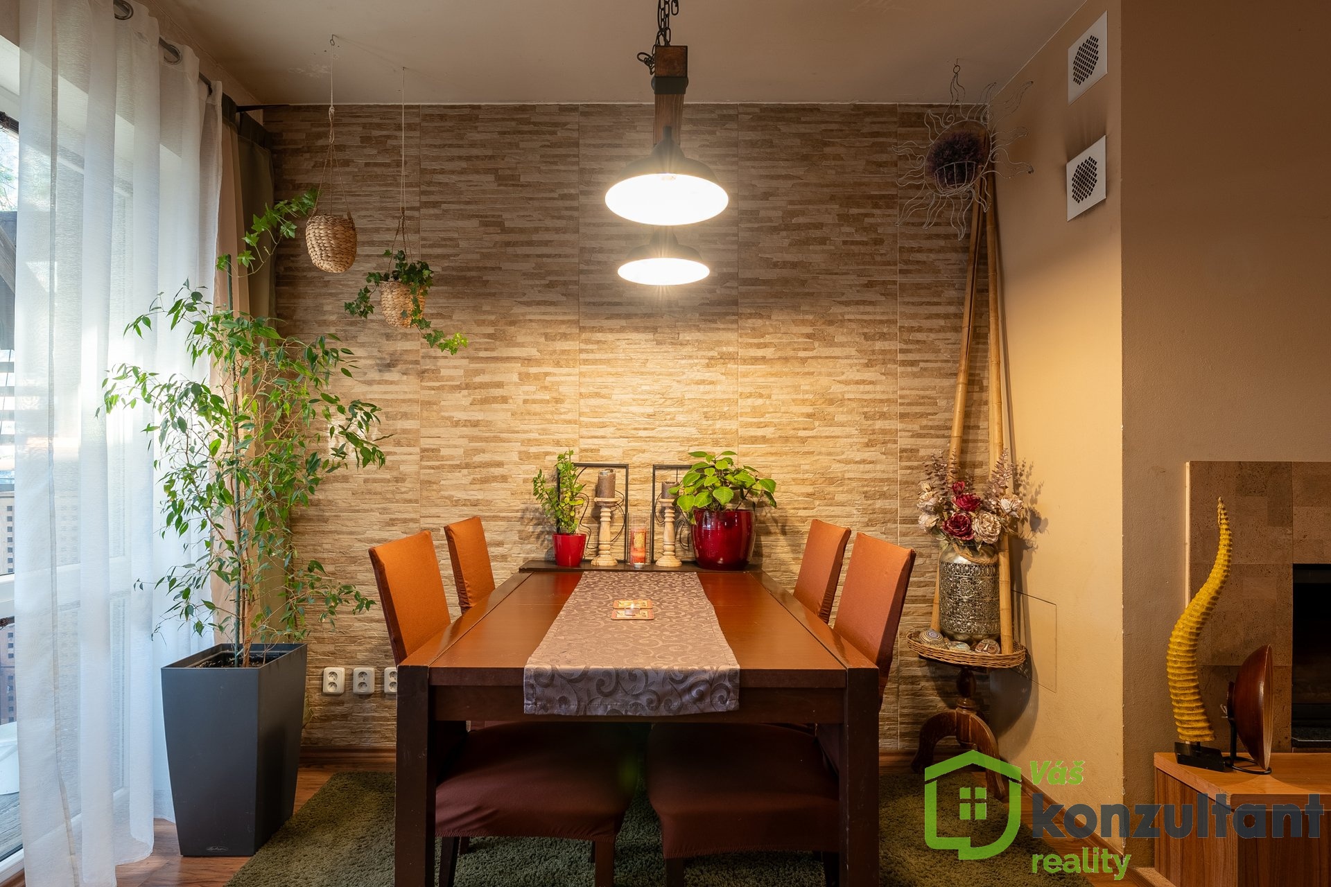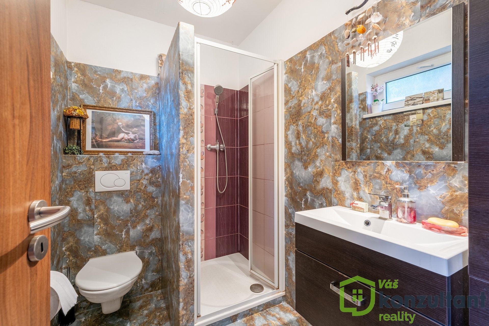 V přízemí se nachází velkorysý obývací pokoj propojený s kuchyní. Kuchyně je vybavena vestavěnými spotřebiči a nabízí dostatek úložného prostoru. Součástí obývací části je také jídelní kout. Příjemnou atmosféru v chladnějších dnech zajistí krb s krbovou vložkou. V přízemí naleznete také koupelnu se sprchovým koutem a toaletou.