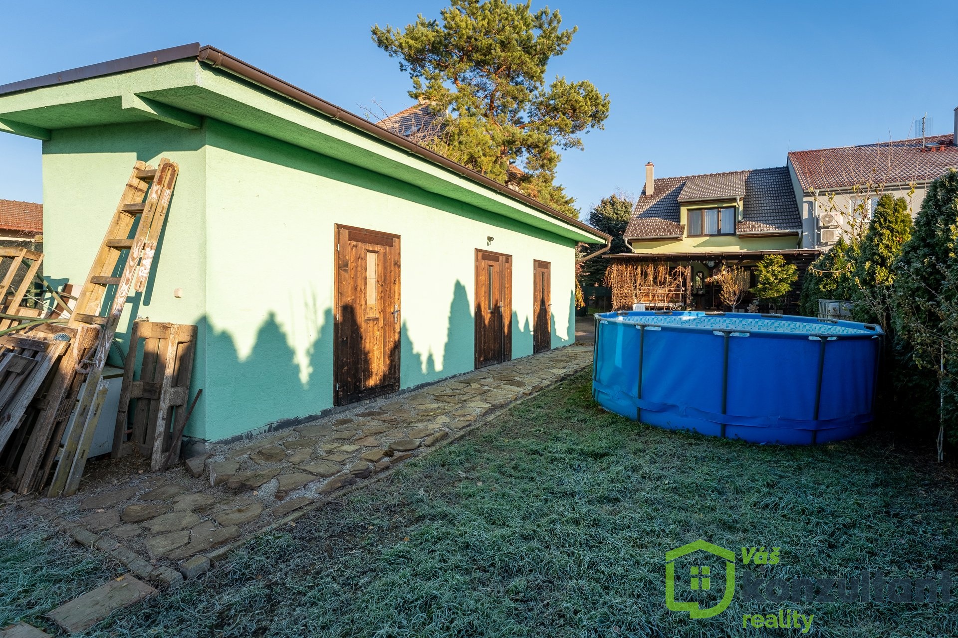 Z obývacího pokoje je přímý vstup na velkou zastřešenou pergolu, která poskytne příjemné posezení s výhledem do zahrady. Na pozemku se nachází také zahradní domek vhodný pro uskladnění nářadí i jako menší dílna pro kutily.